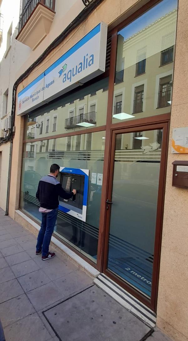 Para disminuir la espera de los ciudadanos en la oficina y poder agilizar todo el proceso de pago de recibos de agua, Aqualia, empresa gestora de este Servicio Municipal en Ronda, ha instalado un cajero automático en el exterior de su oficina.
