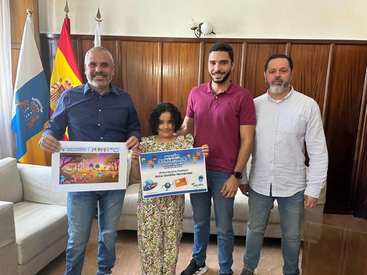 El alcalde de Guía entrega a Alma su premio como finalista del concurso de dibujo de Aqualia